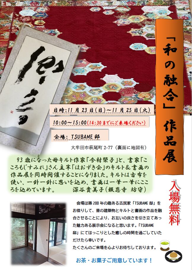 紅葉が美しく色づく季節、古民家TSUBAME邸を会場として「和の融合」作品展が開催されます。